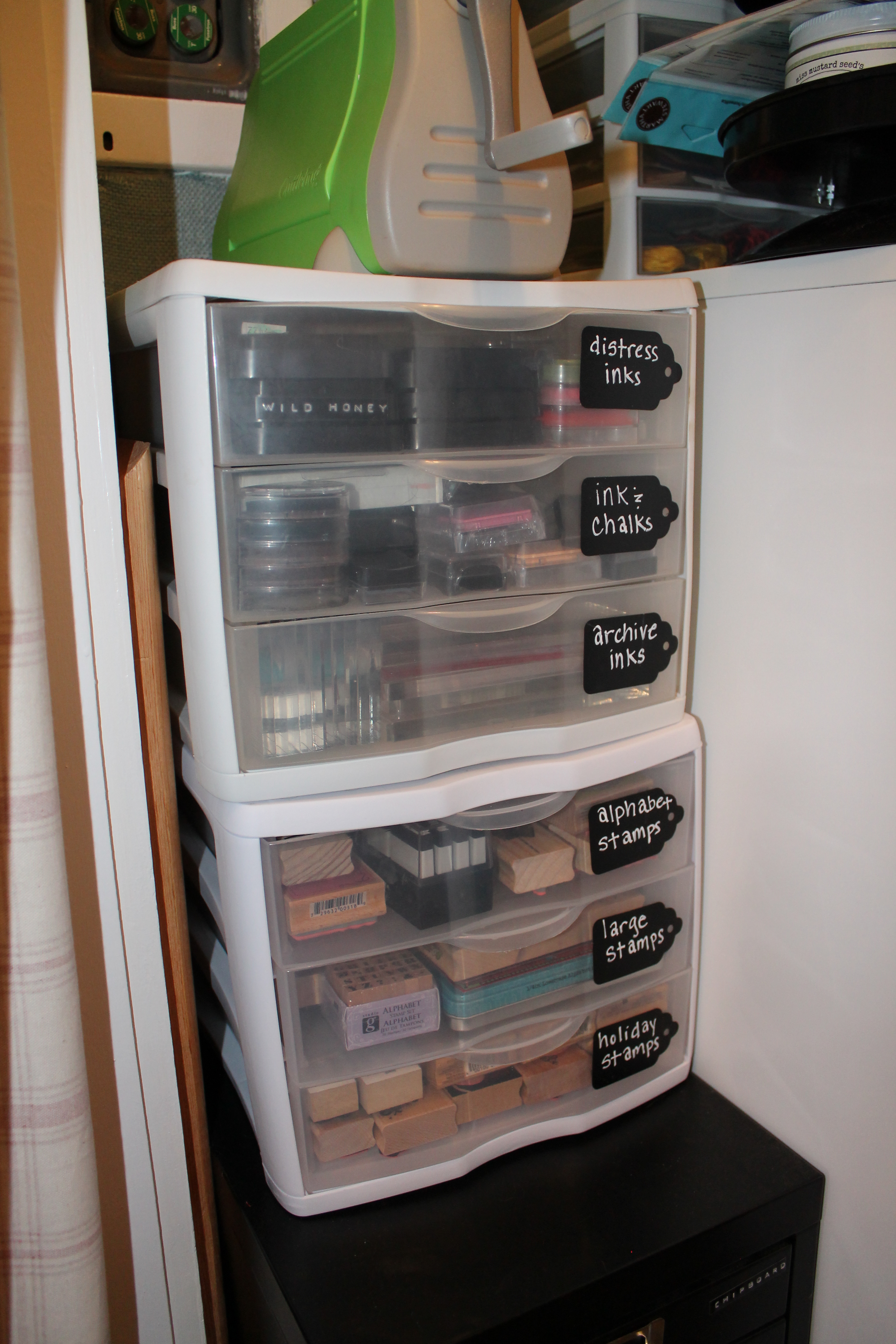 This is the view from a different corner. The cart holds my paper, my Cricut and Silhouette, dies, stamps, and paper cutters. See the little wheels at the bottom? Yeah, my husband was smart enough to know we might need to move it to get something into the room, so he added wheels. The drawers are deep and sturdy. the cabinet next to it is storage for all kinds of things, mostly blanks and stabilizers for embroidery. The other cabinet holds fabric and polyfill, and the baskets hold glue, tape, paper bags, and other things.