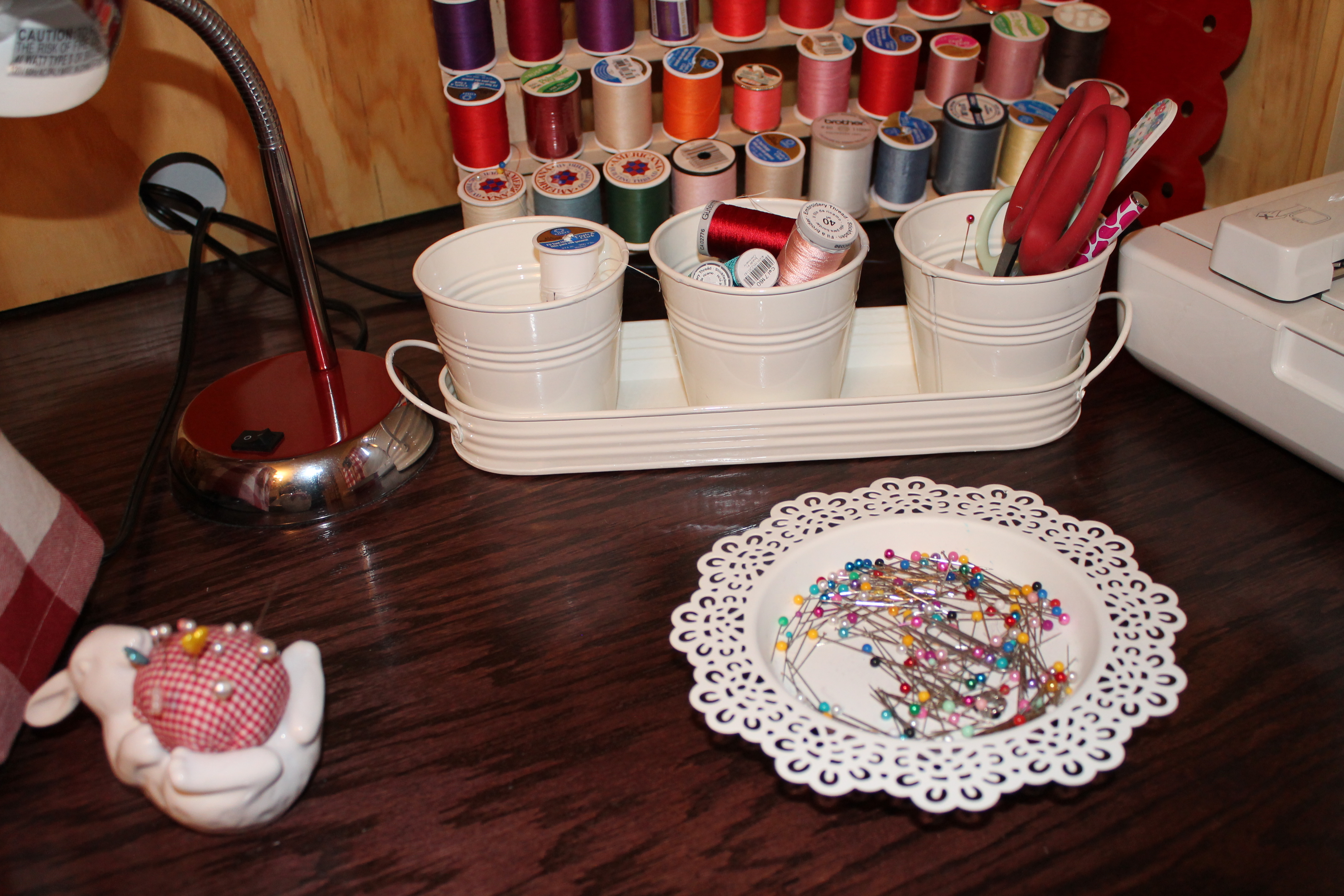 I made this little pin cushion from an egg cup I got at Pottery Barn. It is so much fun to use. You can also see the hole in the back of the cabinet for my sewing machine cords. It is really nice not to have to mess with them running down in front of the cabinet.