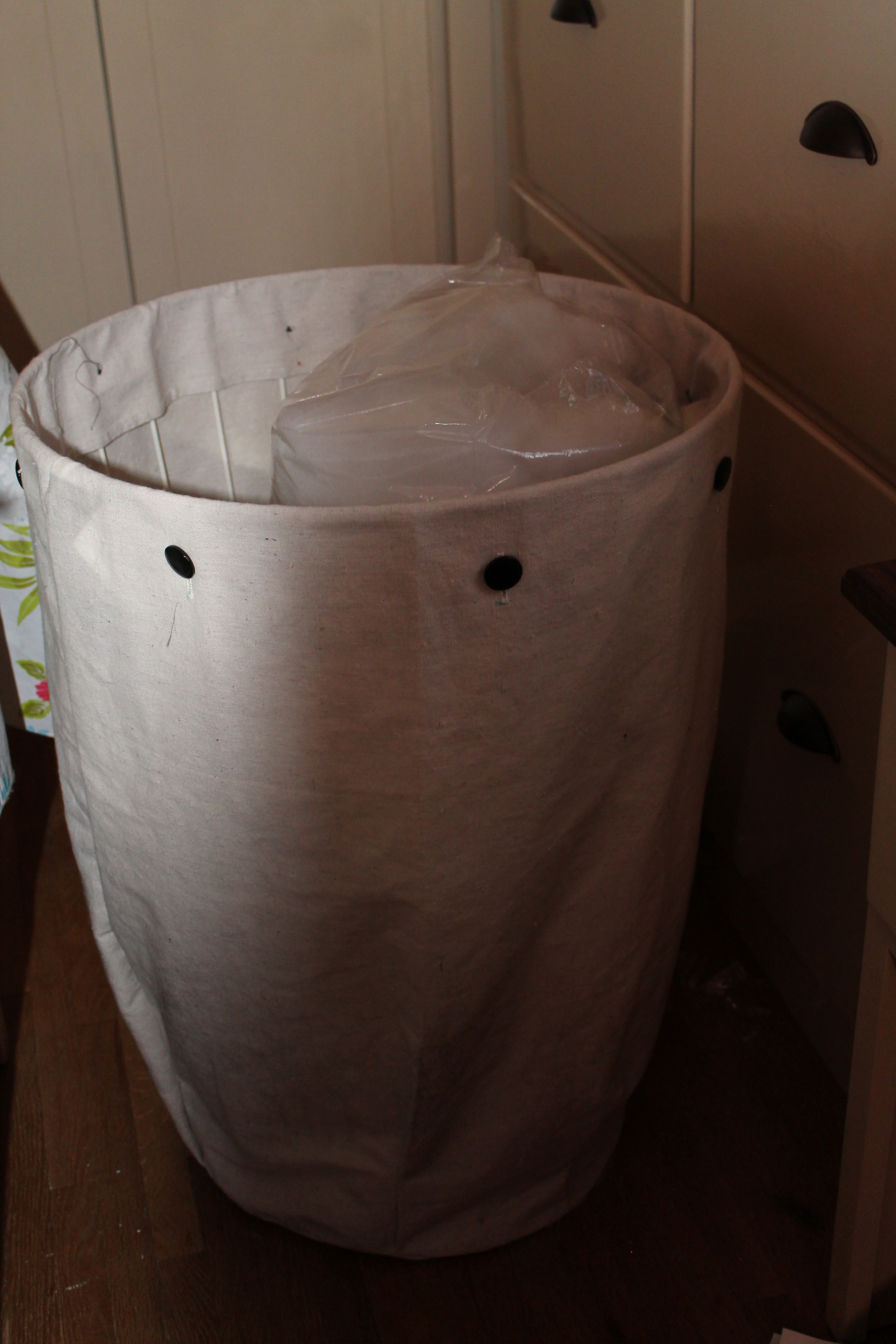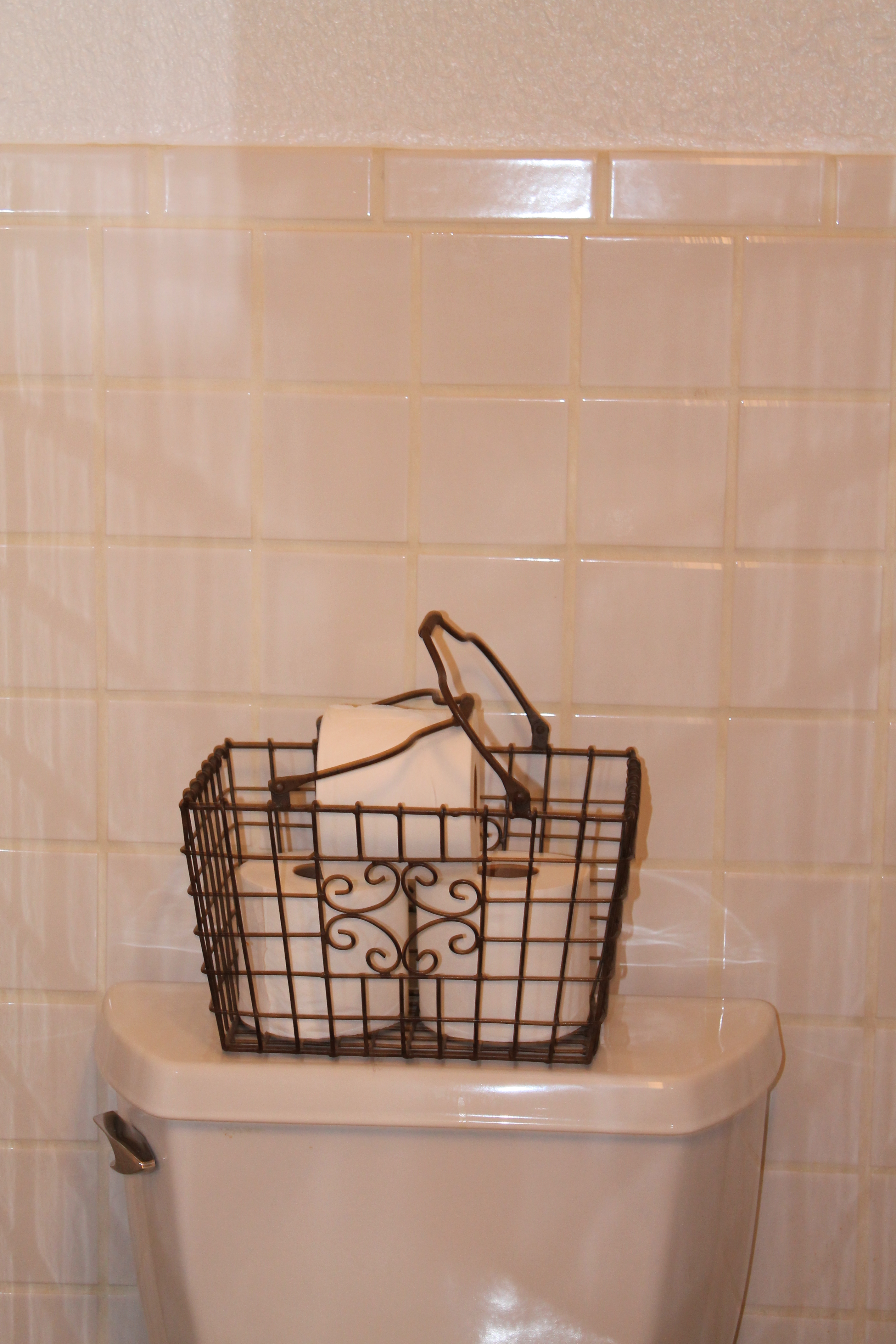 The picture below shows the shelves on the cart, and I have lots of great things stored in baskets and bins. The inside of the cabinets, including the shelves, are left natural so that they will age and get a beautiful patina. He convinced me to paint the walls and trim white since the cabinets are painted in a wheat color, and I think it was a great decision because the room looks less busy.