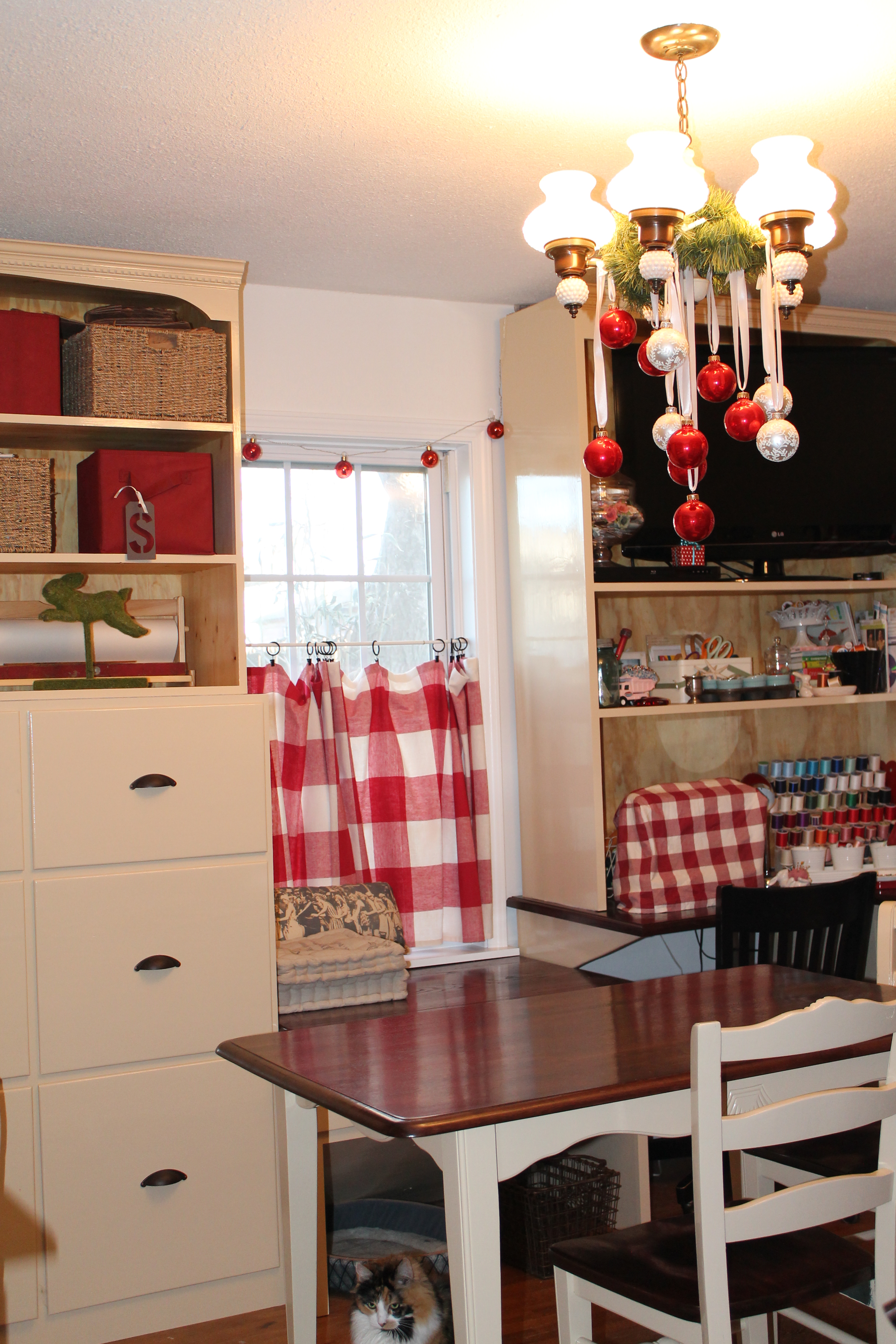 This corner is my sewing corner. I have my Brother sewing machine and my Brother SE400 embroidery machine on my sewing table. I made the curtains and the sewing machine cover. As you can see, my cats follow me everywhere. I’m including some closeup pictures so you can get an idea of some of my storage solutions.